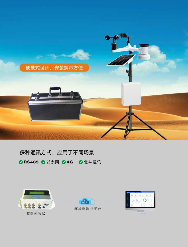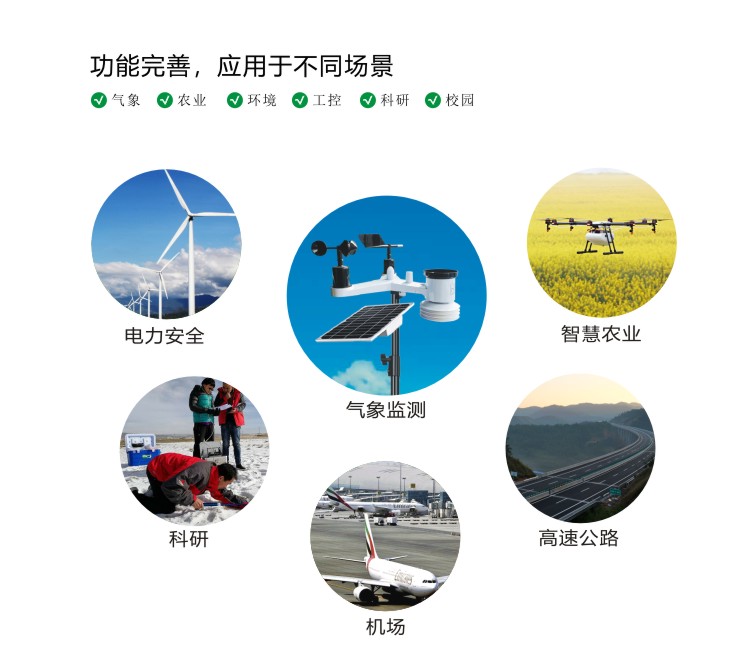 ●測(cè)量風(fēng)速、風(fēng)向、溫度、濕度、氣壓、雨量、光照、紫外、輻射、PM2.5、PM10、噪聲等;