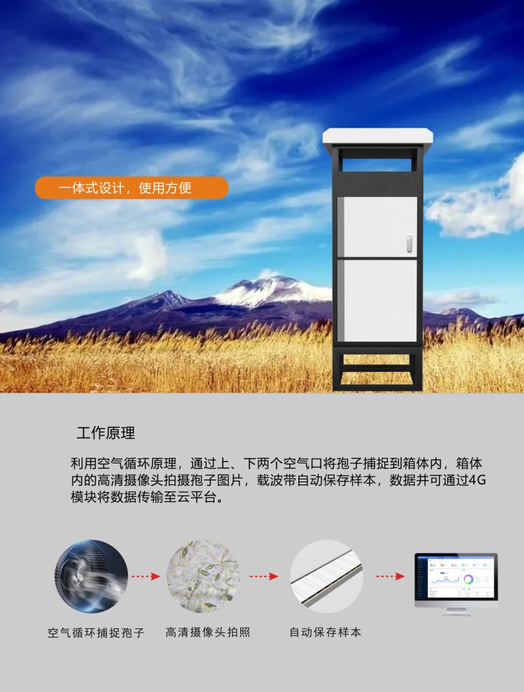 FY-CT300智能孢子捕捉儀是新一代圖像式病菌檢測(cè)工具,專(zhuān)門(mén)收集隨空氣流動(dòng)而傳播的病原菌孢子及花粉塵粒。主要用于檢測(cè)病害孢子存量及其擴(kuò)散動(dòng)態(tài),為預(yù)測(cè)并預(yù)防病害流行、傳染提供可靠數(shù)據(jù)。該設(shè)備主要由孢子捕捉裝置、孢子承載裝置、圖像采集裝置、網(wǎng)絡(luò)傳輸模塊、電源與防雷系統(tǒng)組成。該設(shè)備利用現(xiàn)代光電數(shù)控技術(shù),實(shí)現(xiàn)遠(yuǎn)程自動(dòng)捕捉各種花粉和孢子信息,自動(dòng)更換載玻片,自動(dòng)拍照,圖片數(shù)據(jù)自動(dòng)上傳,自動(dòng)運(yùn)行等功能??筛鶕?jù)需要實(shí)時(shí)對(duì)環(huán)境氣象和孢子病害情況上傳到指定網(wǎng)絡(luò)平臺(tái),專(zhuān)業(yè)分析人員可在平臺(tái)對(duì)每個(gè)時(shí)間段內(nèi)收集到的孢子進(jìn)行手工分類(lèi)與計(jì)數(shù),形成孢子測(cè)報(bào)數(shù)據(jù)庫(kù),供專(zhuān)家遠(yuǎn)程對(duì)病害的發(fā)生與發(fā)展進(jìn)行分析和預(yù)測(cè),為現(xiàn)代農(nóng)業(yè)提供服務(wù),滿(mǎn)足病情預(yù)測(cè)預(yù)報(bào)及標(biāo)本采集的需要,及時(shí)防治病害發(fā)生。