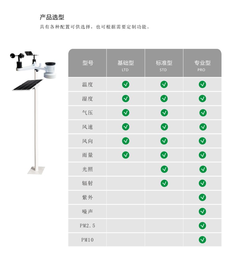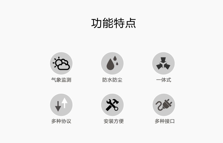 ●測(cè)量風(fēng)速、風(fēng)向、溫度、濕度、氣壓、雨量、光照、紫外、輻射、PM2.5、PM10、噪聲等;