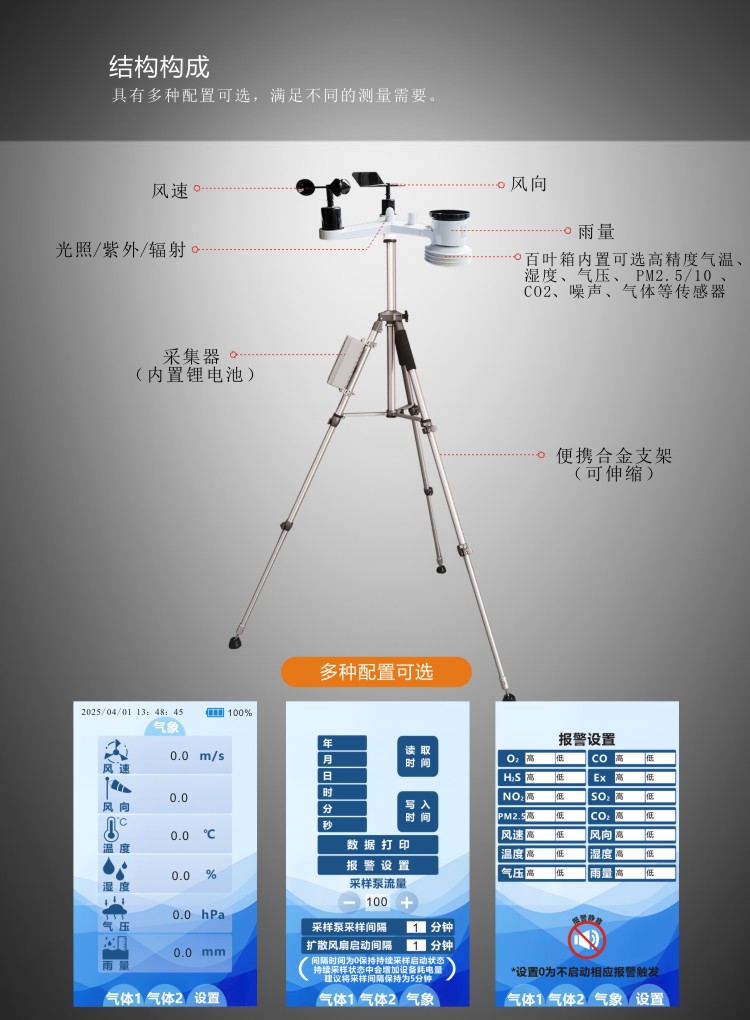 ?可同時(shí)監(jiān)測(cè)風(fēng)速、風(fēng)向、溫度、濕度、氣壓等氣象參數(shù);