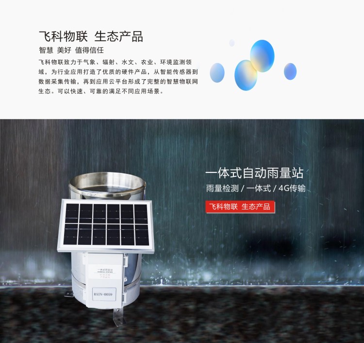 FY-WL700一體式自動雨量站是用于測量雨量水文信息的自動觀測儀器。自動雨量站由數(shù)據(jù)采集儀、雨量傳感器、無線通訊模塊、太陽能供電系統(tǒng)、云平臺軟件等部分構成。數(shù)據(jù)采集儀用于采集及記錄雨量信息,并通過4G無線模塊向云平臺上報數(shù)據(jù),系統(tǒng)采用一體式設計,安裝方便。