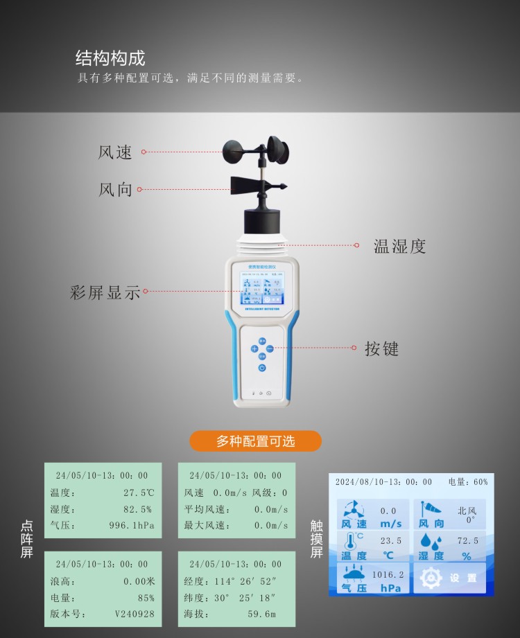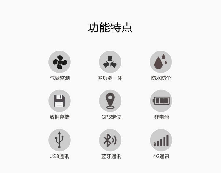 FY-Q2多功能電子氣象儀是一款攜帶方便,操作簡單,集多項(xiàng)氣象要素于一體的可移動式氣象觀測儀器。系統(tǒng)采用精密傳感器及智能芯片,用于測量風(fēng)速,風(fēng)向、溫度,濕度,露點(diǎn),大氣壓力,BF 薄福,風(fēng)寒指數(shù),海拔高度等數(shù)據(jù),并可擴(kuò)展GPS定位功能。內(nèi)置大容量FLASH存儲芯片可存儲至少一年的氣象數(shù)據(jù);通用USB通訊接口,使用配套的USB線纜即可將數(shù)據(jù)下載到電腦,方便用戶對氣象數(shù)據(jù)的進(jìn)一步處理分析。還支持4G無線通訊方式,數(shù)據(jù)可傳輸至云平臺。本儀器可用于農(nóng)林、環(huán)保、海洋、科學(xué)考察等領(lǐng)域。